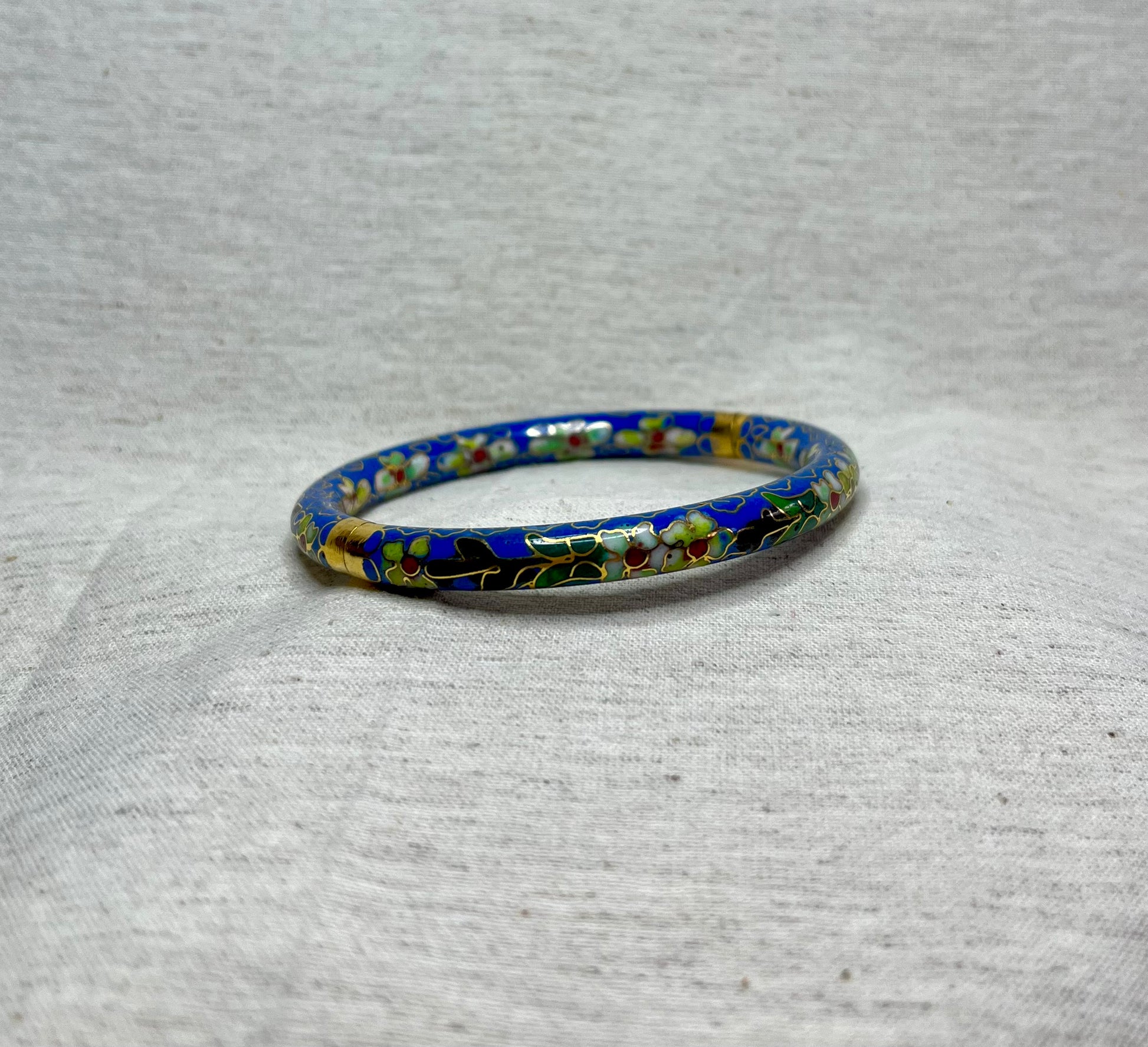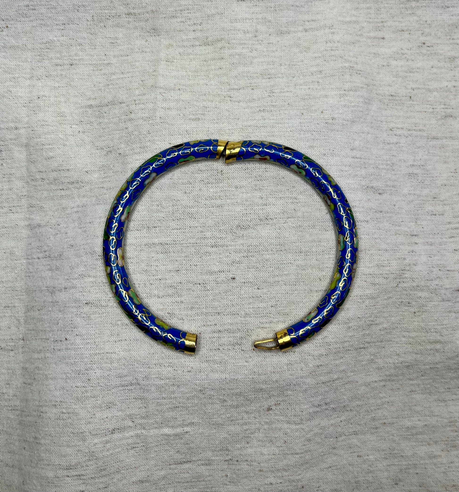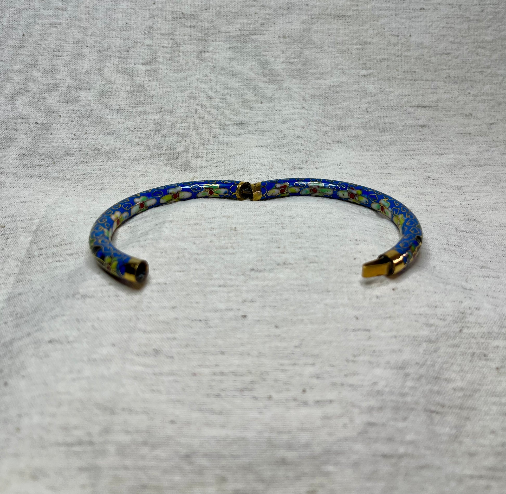 This antique Chinese cloisonne bangle is a stunning bright blue with intricate brass and enamel flowers. It weighs 25 grams and has some slight wear to the outer finish on the hinges. The inner metal of the clasp mechanism has significant wear due to time but it does not affect the function and is hidden when closed.