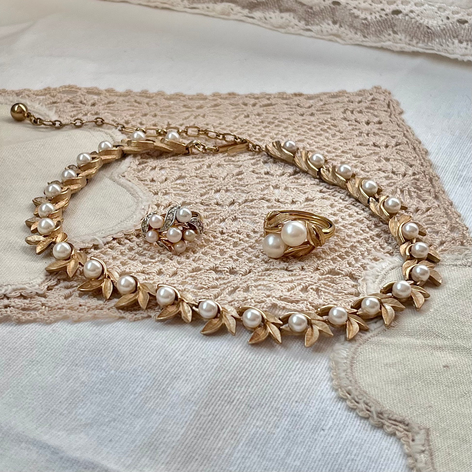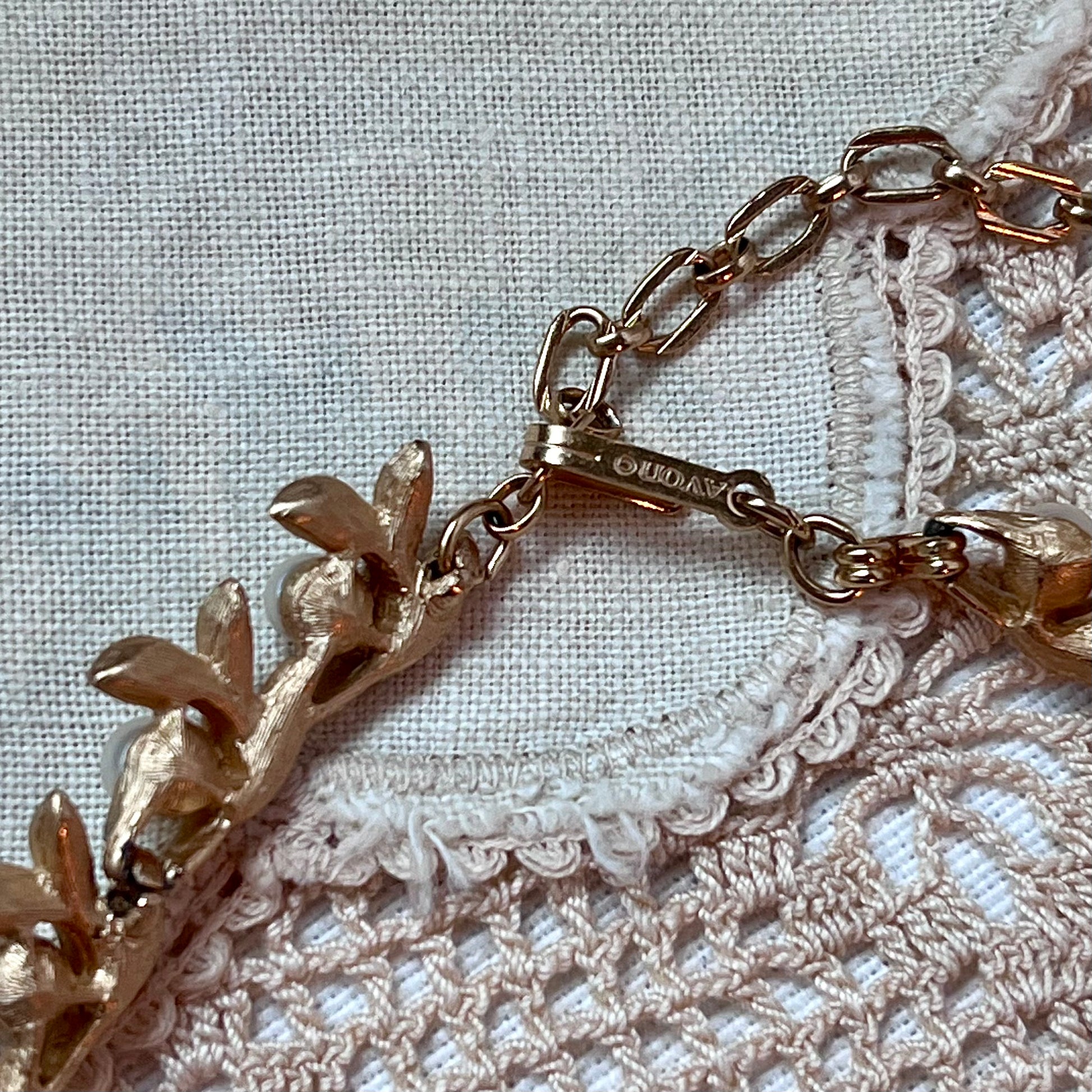This piece is from Avon's first complete collection of designer jewelry released in 1971. The Evening Creation collection featured a necklace, bracelet, two different rings, clip earrings, pierced earrings, and a brooch. Made and stamped by Avon.