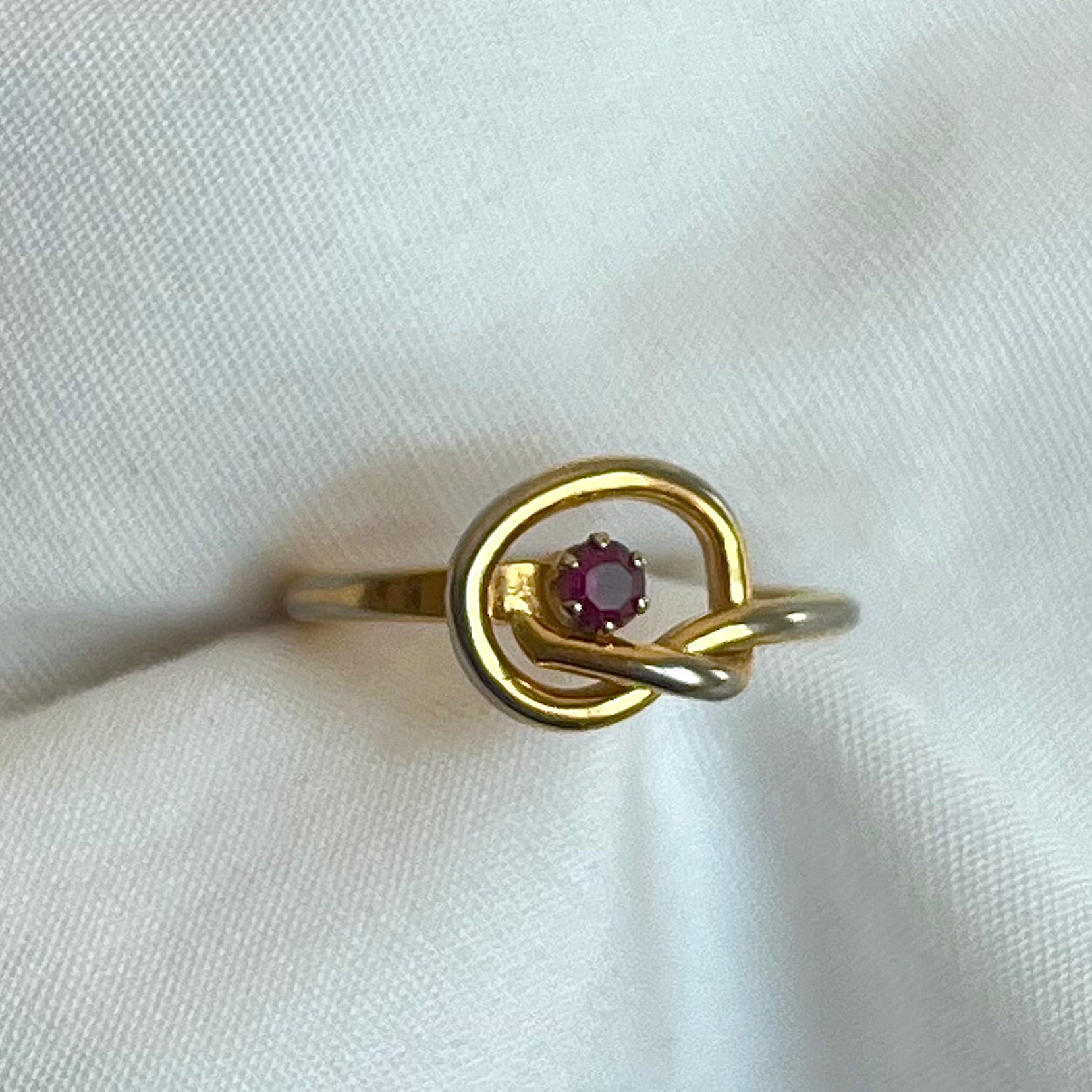 Knot style ring with small amethyst stone, from 1978. Made and stamped by Avon.