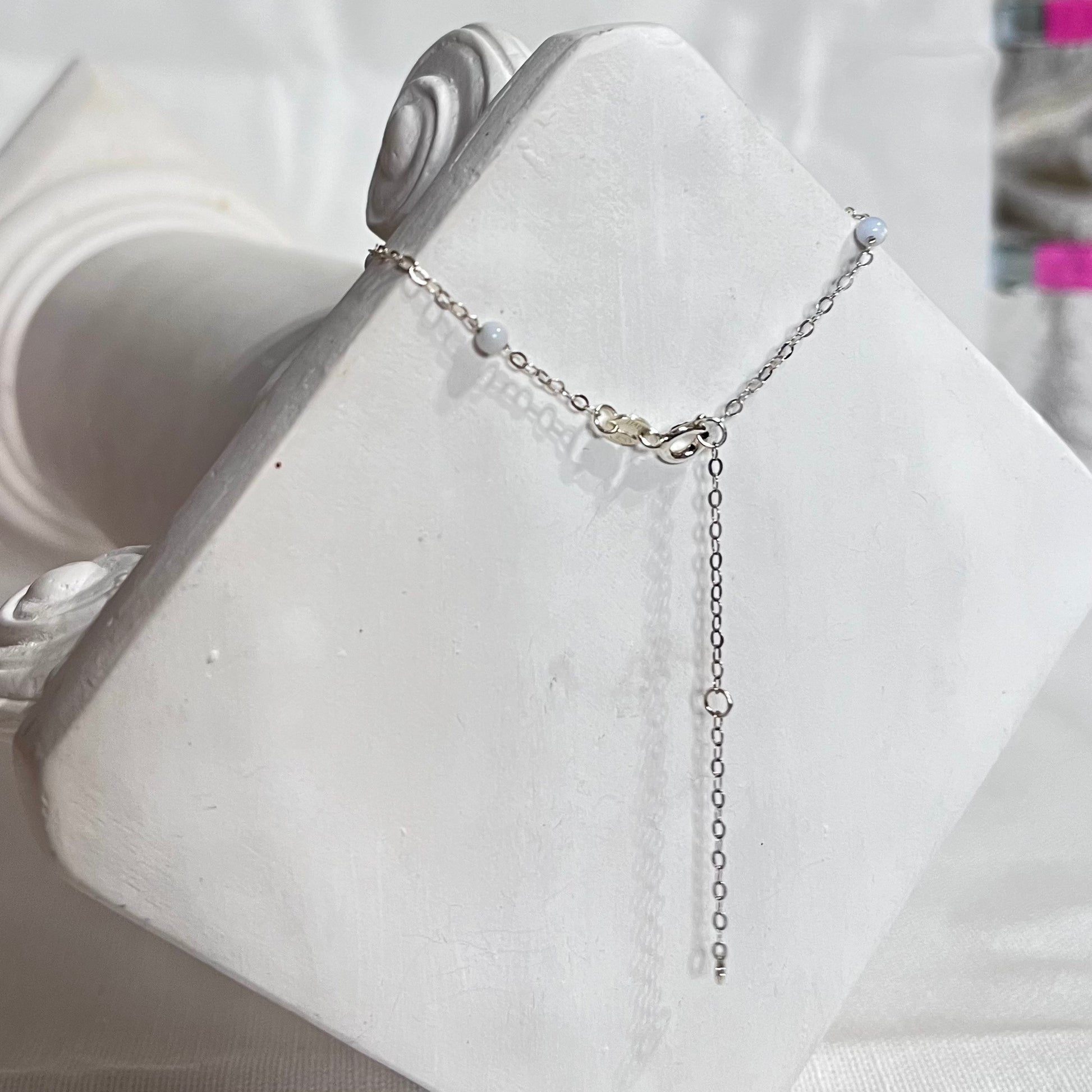 Handmade with a delicately sparkly sterling silver chain and baby blue mother of pearl beads.