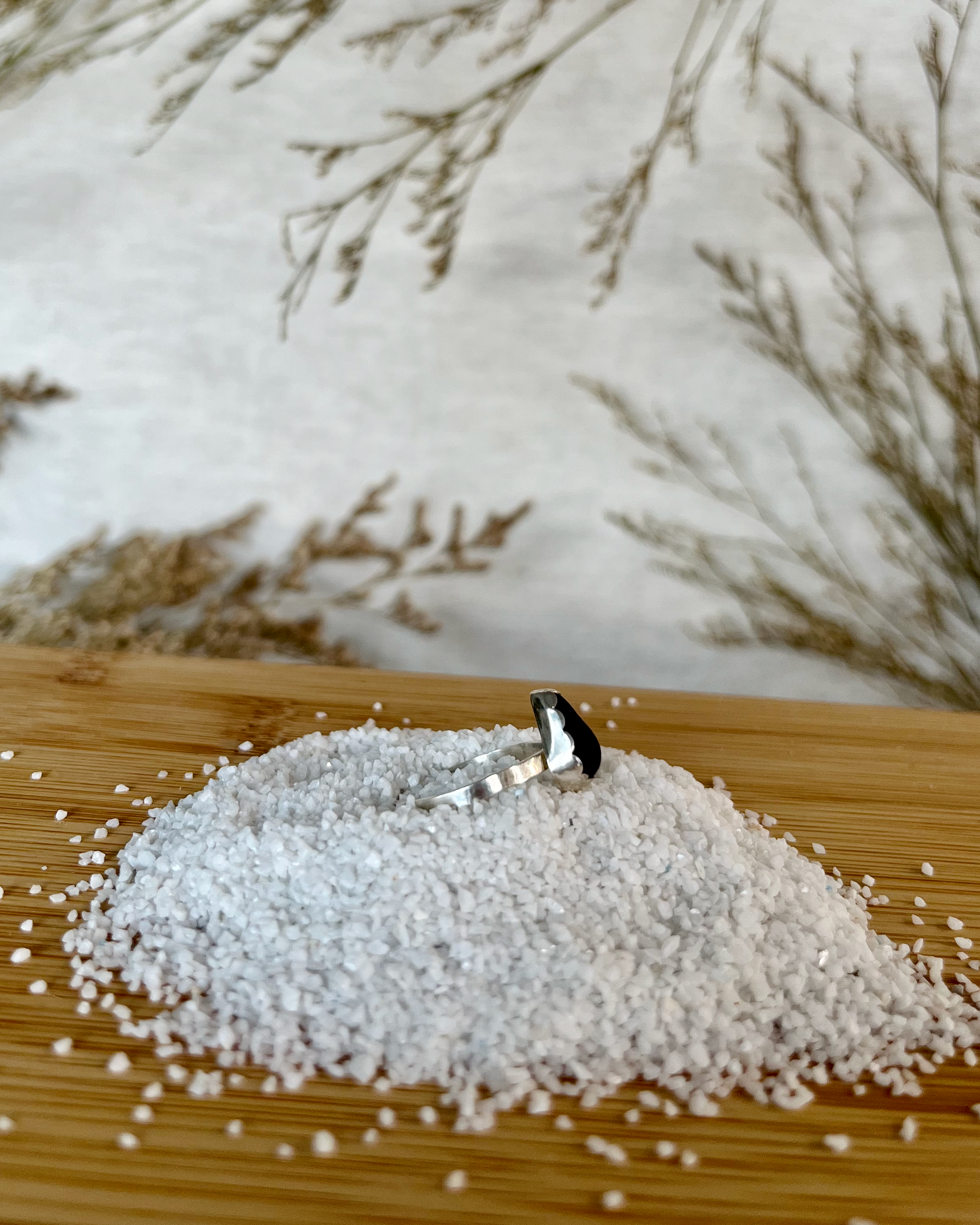 This piece of cobalt blue sea glass is set with a fine silver bezel with scallop details and has a sterling silver band. I found this one on a beach in Bucerias, Mexico.