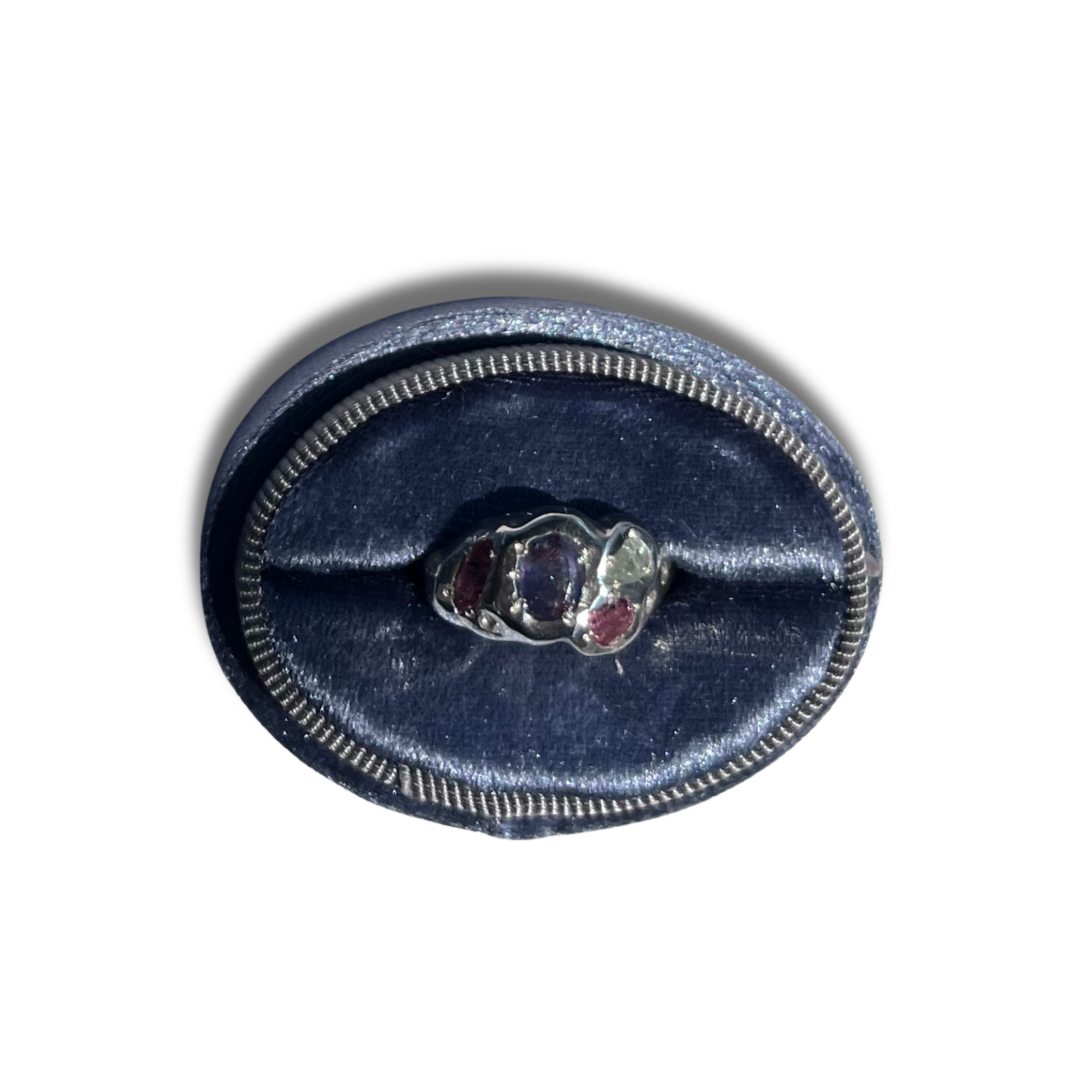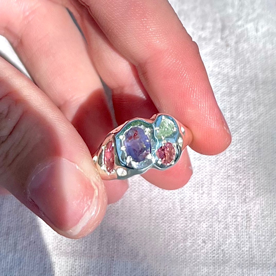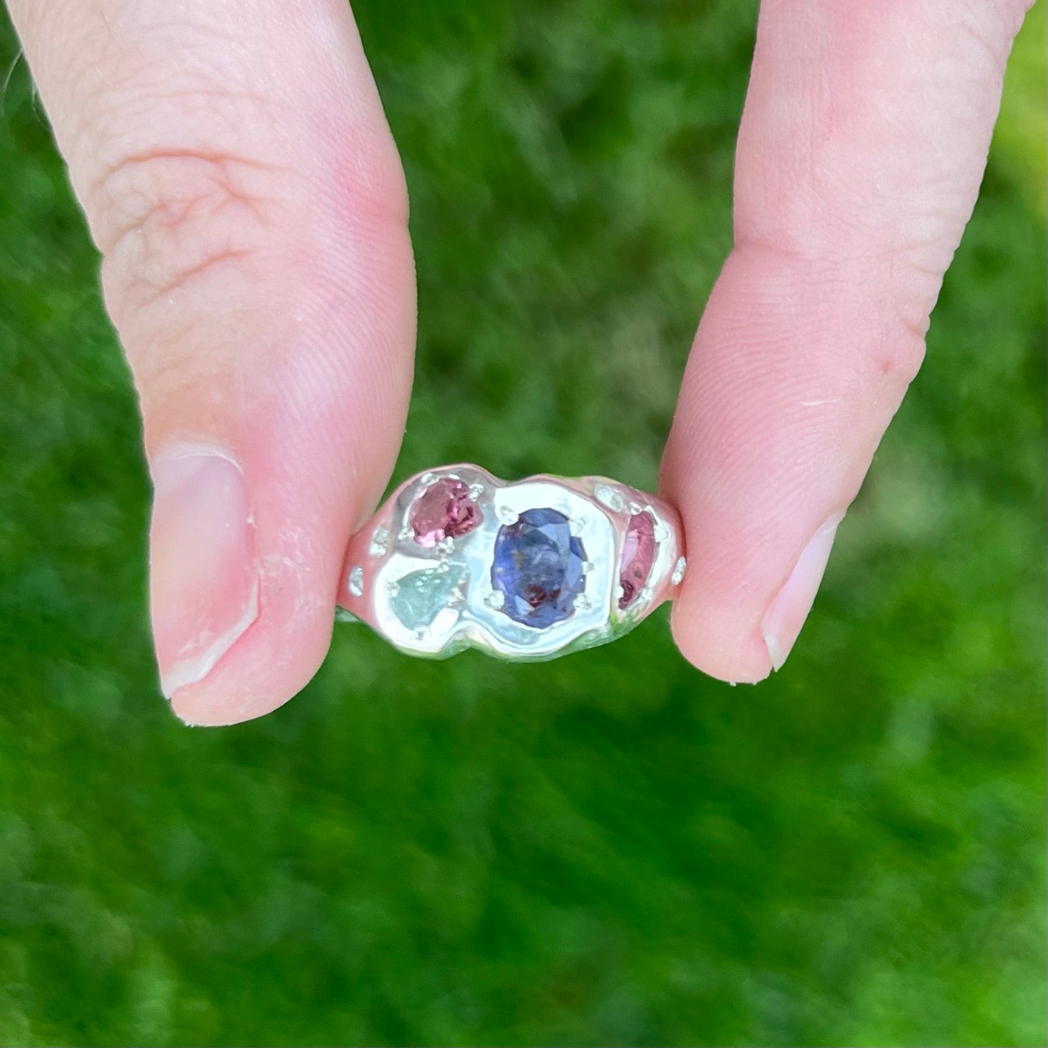 Made in solid sterling silver and featuring a beautiful confetti iolite, 3 tourmalines, and 4 petite white topaz.