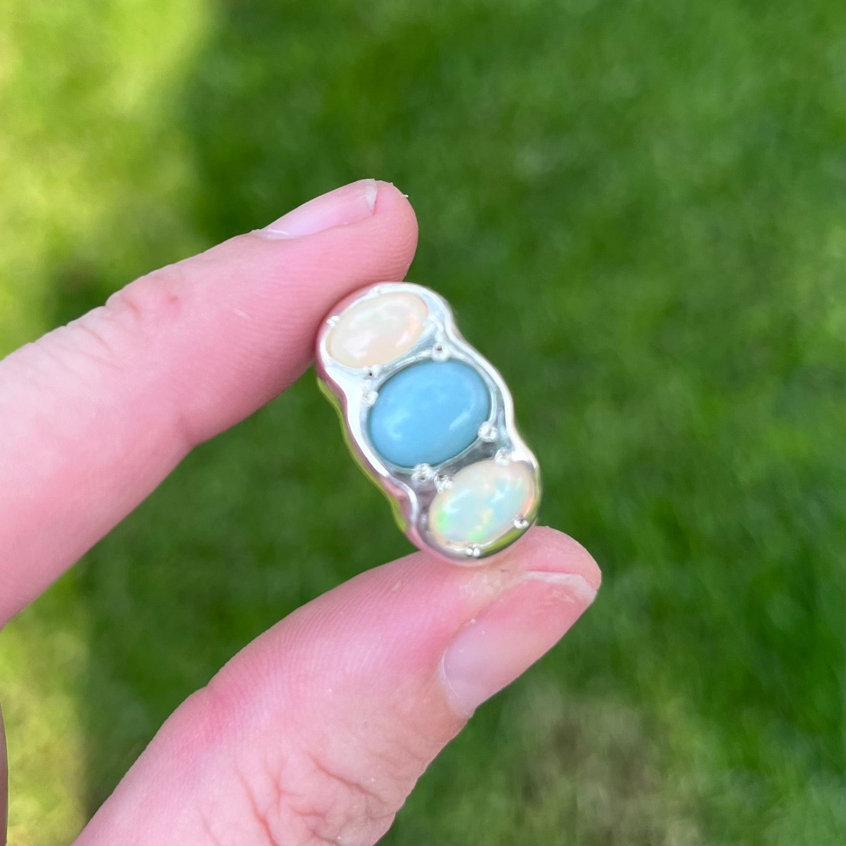 Follow the ebb and flow of the tides with this dreamy blue amazonite flanked by two fiery ethiopian opals.