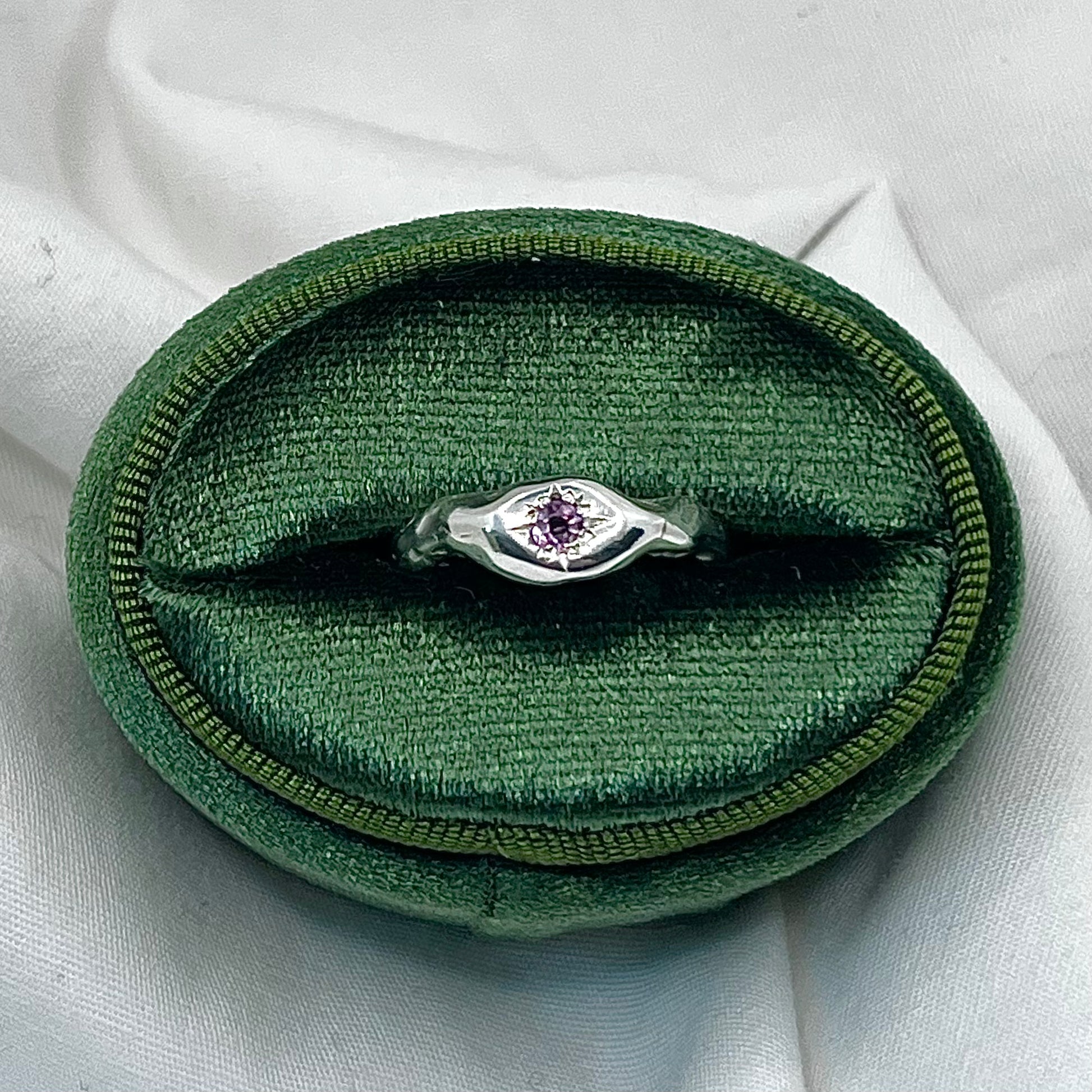 A bright pink sapphire set in a hand engraved star setting. Made in sterling silver.