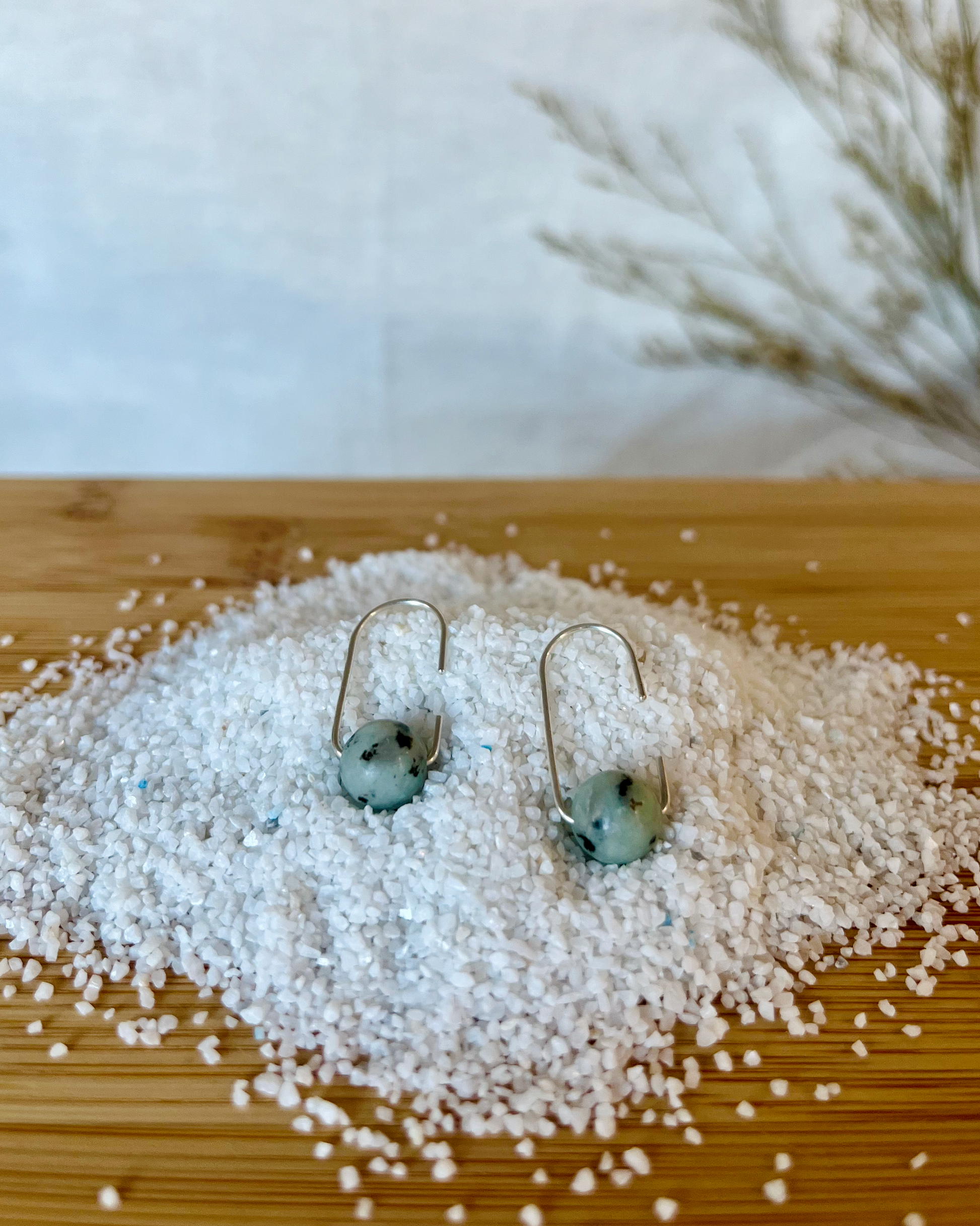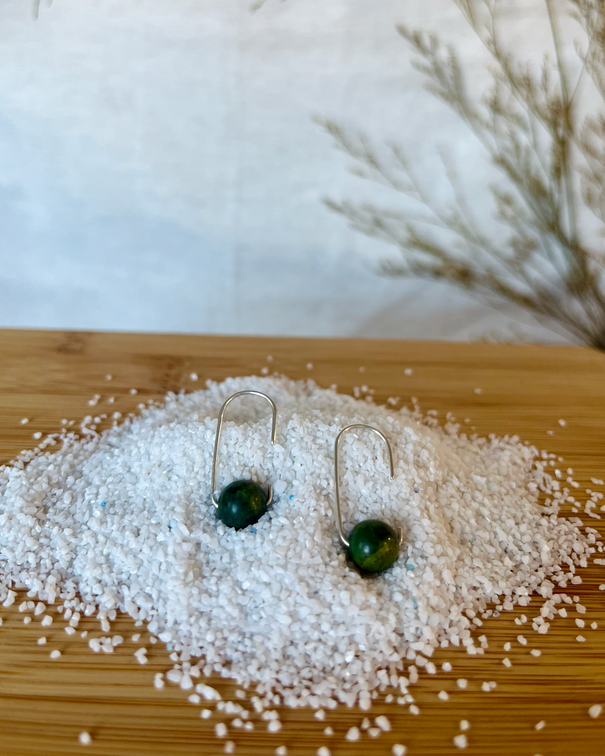 A minimalist dangle style with a variety of 8mm round semi precious stone beads on hand-shaped sterling silver wires. They are about 1 inch or 2.5cm long.